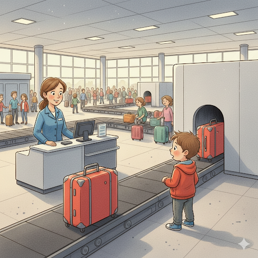 Drinnen war es noch viel größer! Ben sah unzählige Schalter, an denen Menschen in Uniform standen. Sie nahmen die großen Koffer entgegen. Ben beobachtete, wie ihr roter Koffer auf ein langes Band fuhr und dann in einem dunklen Tunnel verschwand. „Wo geht der denn hin?“, fragte Ben neugierig. Mama erklärte, dass die Koffer jetzt schon zum Flugzeug gebracht wurden. Was für eine Reise!