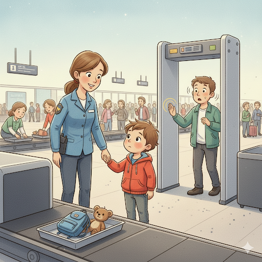 Als Nächstes mussten Ben und Mama durch eine Sicherheitsschleuse. Ben musste seinen Rucksack und sogar seinen kleinen Teddybären in eine Kiste legen, die dann durch einen dunklen Tunnel fuhr. Dann durfte er selbst durch einen großen Rahmen gehen, der leise piepte. Mama lachte: „Keine Sorge, das macht er immer, wenn jemand mit zu viel Superhelden-Energie vorbeikommt!“