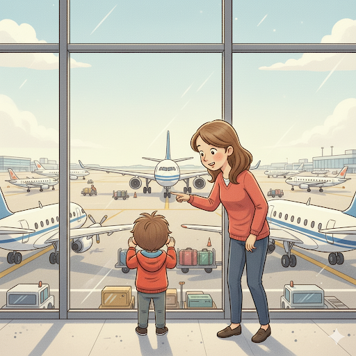 Mama zeigte auf ein großes, weißes Flugzeug ziemlich weit weg. „Das da“, sagte sie. „Siehst du den blauen Streifen an der Seite? Das ist unser Vogel für heute.“