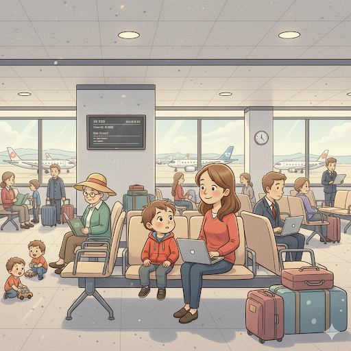 Ben fand das Warten langweilig. Er zählte die Koffer, die an den Wänden standen, und versuchte, die fremden Sprachen zu erraten, die er hörte. Er sah einen Jungen, der ein Auto-Spielzeug vor und zurück schob und dabei lustige Geräusche machte. Ben kicherte.