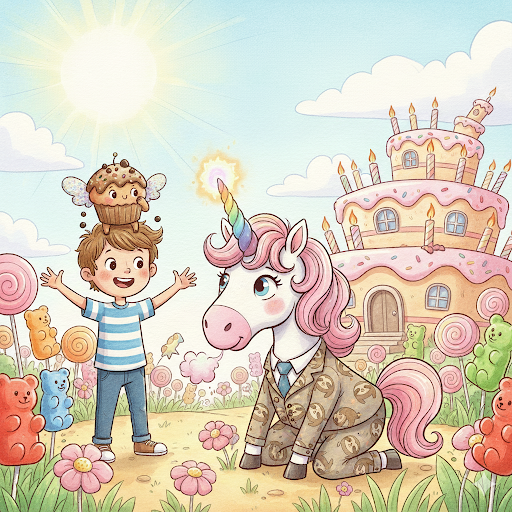 Krümel, der immer der mutigste Muffin war, piepste aufgeregt und flatterte zur Tür. Als Finn und Krümel in den Garten rannten, trauten sie ihren Augen kaum. Direkt in Finns riesiges Blumenbeet, das voller Gummibärchenblumen und Lutschersträuchern war, war etwas Großes und Glitzerndes gelandet. Es war… ein Einhorn! Aber nicht irgendein Einhorn. Dieses Einhorn hatte eine Mähne aus kunterbunten Zuckerwatte und ein Horn, das wie ein gedrehter Regenbogen aussah. Und das Witzigste: Es trug einen kleinen, viel zu engen Anzug mit Faultier-Muster!