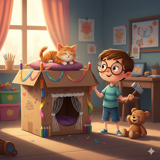 „Das wird das stabilste und schönste Katzenhaus aller Zeiten!“, verkündete Finn stolz, während er die Pappschachtel zurechtschnitt. Er schnitt ein rundes Loch als Eingang aus. „Damit Prinzessin Fluffy bequem rein- und rauslaufen kann“, erklärte er.