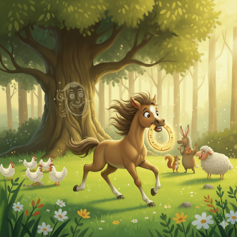Tief im Wald, unter einem besonders knorrigen Baum, der aussah, als hätte er tausend Geschichten zu erzählen, stolperte Felix über etwas Glänzendes. „Was ist das denn?“, fragte er sich und stupsde es vorsichtig mit seiner Nase an. Es war ein Hufeisen! Aber kein gewöhnliches. Es glänzte nicht nur golden, sondern schien auch eine seltsame Inschrift zu tragen.