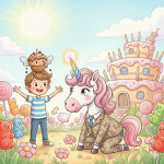 Es war einmal, in einem kleinen, sonnigen Tal, umgeben von blühenden Wiesen und duftenden Blumen, da lebte ein junges, freches Fohlen namens Felix. Felix war kein gewöhnliches Fohlen. Oh nein! Er hatte eine Mähne so wild wie ein ungestürmter Bach und einen Schweif, der bei jedem seiner Sprünge wie ein lustiger Wedel durch die Luft fegte. Seine Lieblingsbeschäftigung war es, über die Wiesen zu galoppieren, bis seine Beine müde wurden und seine kleinen Hufe Staubwolken aufwirbelten, die aussahen wie kleine, tanzende Gespenster.