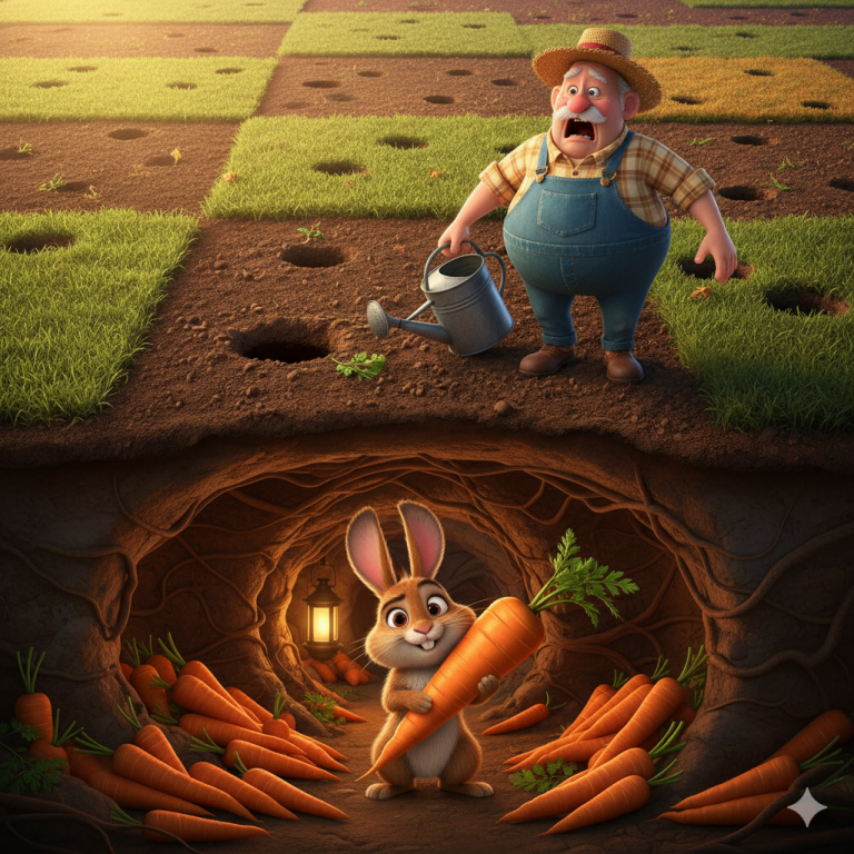 „Ich muss an diese Karotten kommen“, sagte er sich. Aber wie? Das Feld war von einem stabilen Zaun umgeben, und Bauer Johann hatte Augen wie ein Adler. Ein direkter Angriff bei Tag war unmöglich. Hopsi dachte nach, seine lange Nase wackelte dabei auf und ab. Wenn der Weg über der Erde versperrt war, musste er eben einen Weg unter der Erde finden!