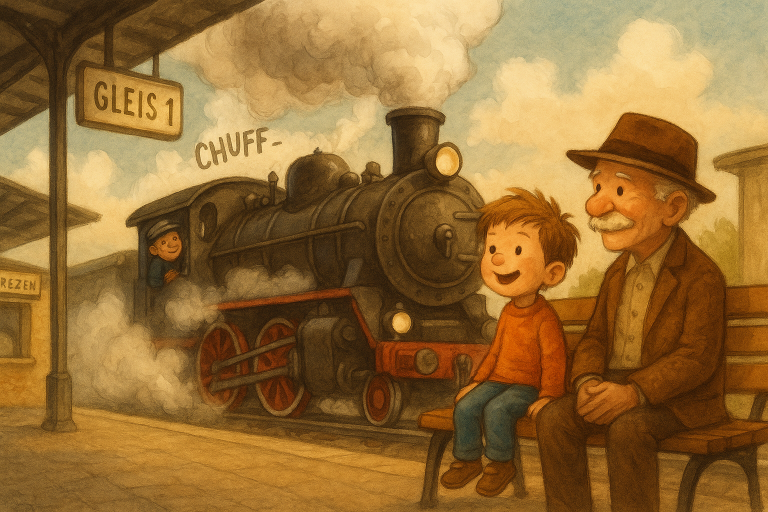 Leo rutschte auf der Bank hin und her, seine Beine baumelten aufgeregt in der Luft. Er kannte sie alle, die Züge, die hier hielten. Zuerst kam meistens der „rote Flitzer“, wie Leo ihn nannte. Das war der Regionalzug, der die Menschen in die Nachbarstädte brachte. Er kam immer pünktlich mit einem leisen Surren an und bremste mit einem langen „Quiiiietsch“. Die Türen öffneten sich mit einem Zischen, und Menschen stiegen ein und aus, winkten zum Abschied oder umarmten sich zur Begrüßung.
