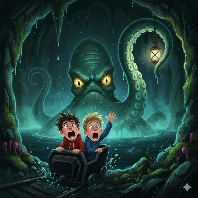Zuerst sahen sie nur zwei riesige, gelb leuchtende Augen, groß wie Scheinwerfer, die sie aus der Dunkelheit anstarrten. Dann tauchten riesige, schleimige Tentakel auf, die sich peitschend aus dem Wasser erhoben und auf ihren Wagen zuschlugen. Ein gewaltiges Meeresungeheuer, ein Kraken, war direkt vor ihnen! Einer der Tentakel schnellte direkt auf sie zu. Er war so nah, dass sie den modrigen Geruch des Tiefseeschlamms riechen konnten, der an ihm klebte.