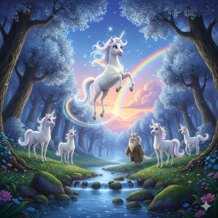 Im verborgenen Herzen des Glitzerwalds, wo alte Bäume mit silbernen Blättern in den Himmel ragten und ein Fluss aus flüssigem Mondlicht sanft durch bemooste Steine plätscherte, lebte eine Herde prächtiger Einhörner. Jedes von ihnen war ein Wunder an Anmut: ihr Fell schimmerte wie frisch gefallener Schnee, ihre Mähnen und Schweife glänzten in allen Farben des Regenbogens, und auf ihren Stirnen wuchs ein einzelnes, spiralförmiges Horn, das mit jedem Sonnenstrahl in magischem Glanz erstrahlte.